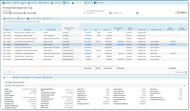 On major projects where the EIA-748 compliance standards are required for how change orders are managed, 4castplus EVMS easily meets these requirements. Key to this compliance is that 4castplus enables project controls to establish change order stages for the incremental completion, visibility, impact and approval of a change order. Stages in 4castplus can be configured to meet the varying requirements of different organizations may have. Permissioned users can optionally override certain stages for cases where they’re not necessary. Ultimately, change orders can be routed through a multi-stage approval workflow before they are committed to the Current Budget. Until that time, they are visible in the Pending Budget as a Pending Change Order.