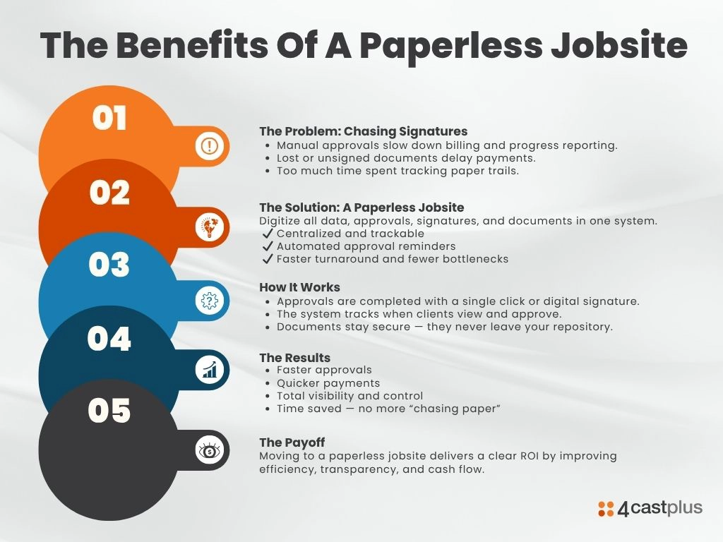 Moving to a Paperless Jobsite has never been easier, and by eliminating the Chasing Paper fiasco, it has a clear return on the modest investment in making the move.
