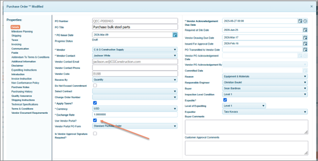 When the buyer is creating the purchase order, they have the option to select whether or not to leverage the Vendor Portal to manage the communication and document exchange with the supplier or subcontractor.