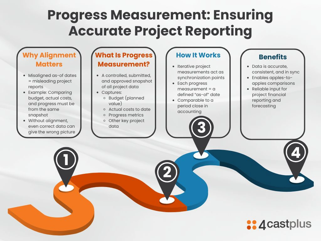 What, then, is the connection between this idea of measuring the project, and aligning its reporting to an ‘as-of’ date? It can’t be understated how important it is to align all project reporting to a specific point in time. A persistent challenge to the accuracy of what’s being reported, is when a report is showing data elements from differing as-of dates. When comparing, for example, budget (planned value) against incurred cost to date, and against progress, it’s crucial that the report shows those three values from precisely the same snapshot in time. Otherwise, even if the underlying data is correct, this comparison will most certainly be misleading. To achieve that data alignment to a point in time, there needs to be some definition as to what that point represents. It’s these cycles of measuring the project on an iterative basis that become the perfect events for synchronizing project data for reporting. We at 4castplus refer to this as the “Progress Measurement”. A progress measurement in 4casplus isn’t just a theoretical idea, it’s an actual thing that is controlled, submitted and approved. All project data – including budget, actual cost, progress and many other metrics and data elements – is saved as part of the progress measurement. This, therefore, becomes the focal point for where project reporting data is drawn from.