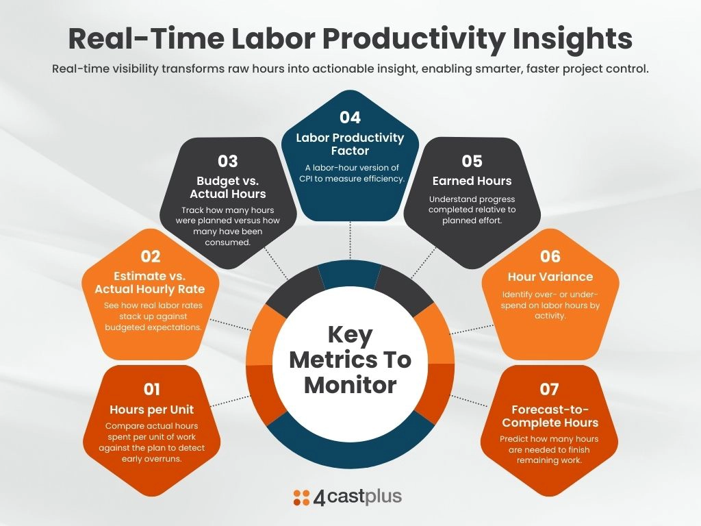 Labor productivity is a critical metric to stay on top of throughout a project. It provides continuous visibility into performance indicators such as: