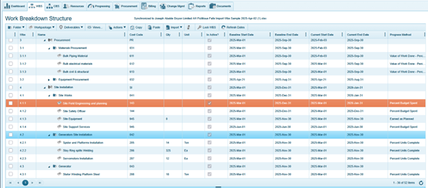 Best practices in WBS design are beyond the scope of this paper; it is worth mentioning that the WBS needs to be defined down to the activity level, where activities are designed to be measurable in terms of budget, cost, and physical progress. You may refer to Activities as Tasks or Work packages, but in any case, they represent the lowest level of the WBS, and it’s from there that the project is budgeted, tracked, progressed, and reported on. This is important, as these elements need to converge at the activity so that they can be compared against each other. The screenshot below shows a section out of a work breakdown structure showing the activity at the lowest level, and how they roll up to each level above that in the hierarchy.
