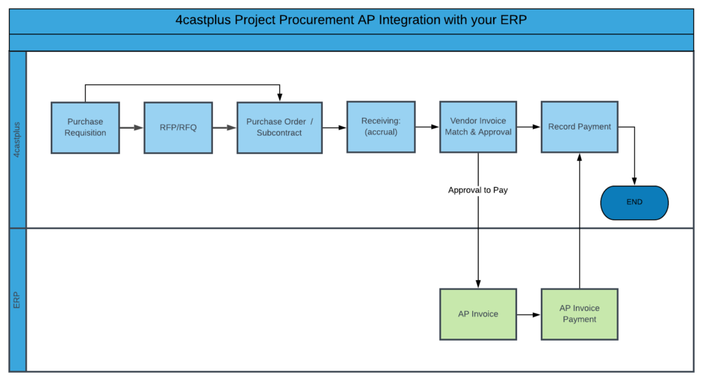 When you integrate 4castplus with your finance system (ERP), an authorization-to-pay notification will be sent to the ERP’s AP area to indicate a vendor invoice can be paid. All invoice details, vendor data, amounts, codes, etc. will be attached to this integration data flow.